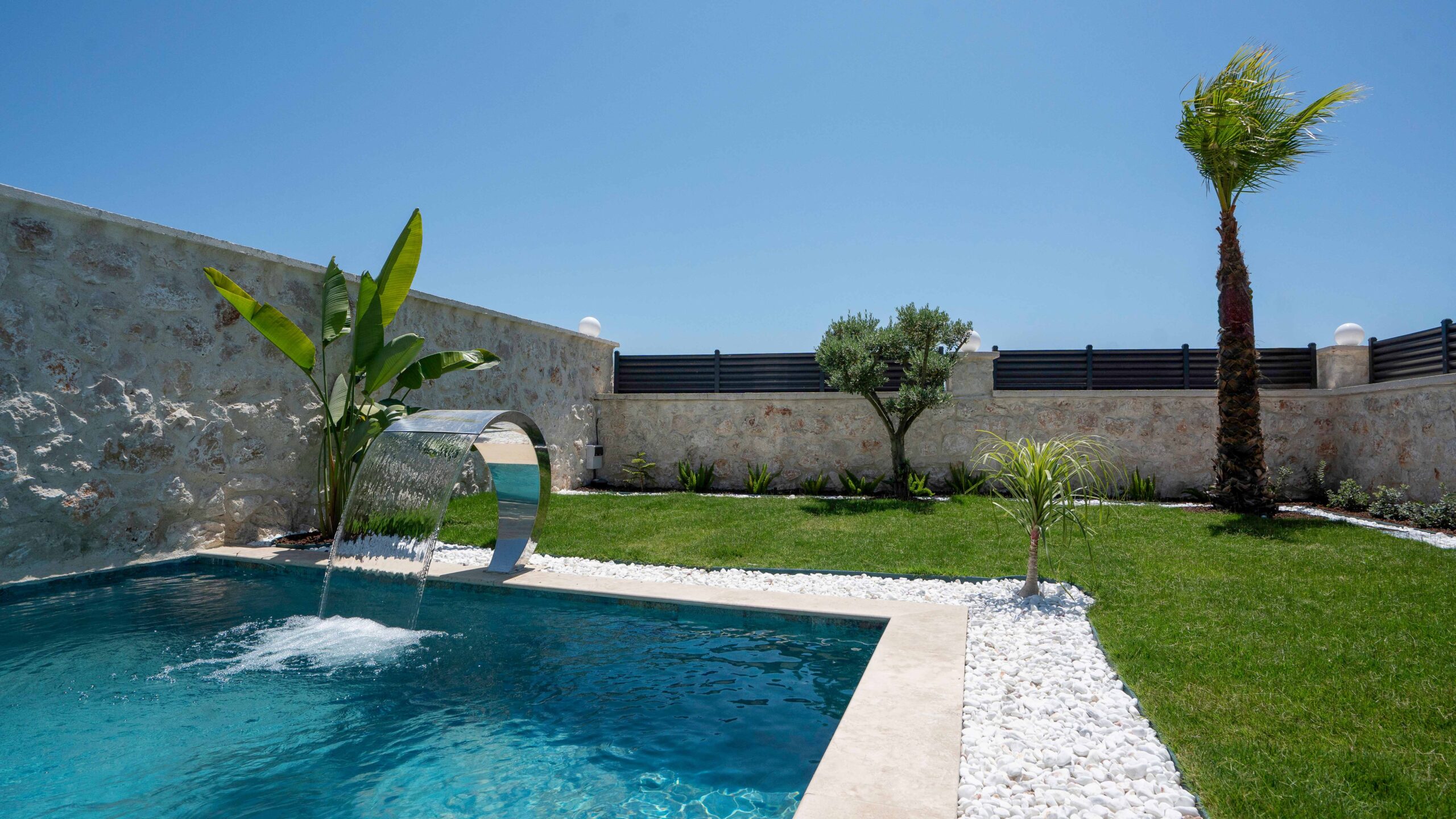 Une piscine devant chaque villa, rien que pour vous. Entourée d'un mur de pierre sur trois côtés et invisible de l'extérieur, le silence et l'intimité sont garantis. Ici, ce n'est pas la crème solaire qui laisse son empreinte, mais le temps qui passe.